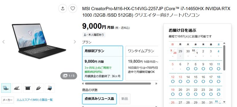 たとえばハイスペックなノートPCが月額9000円で利用でき、3か月使うと解約料が0円になる。「レンティオ」の場合、故障時に利用者の過失がないときは、賠償費用が掛からない。また、36か月使うと月額課金が終了する。