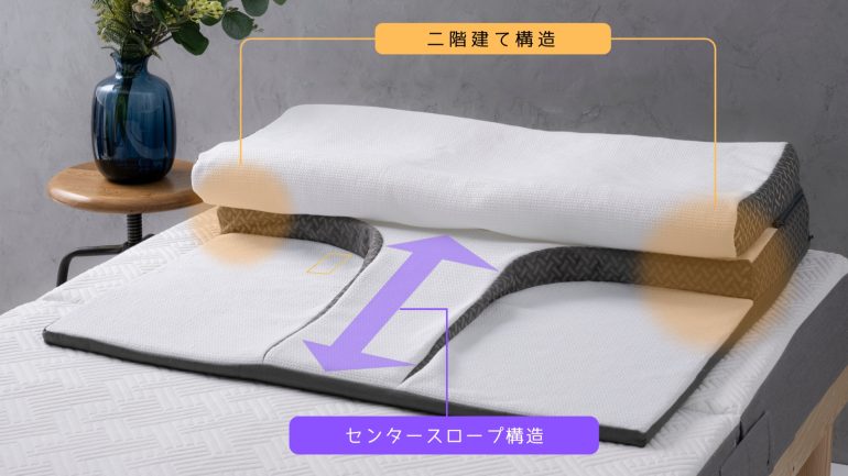 一方、センタースロープ構造は、仰向け寝時に自然と胸を開き、大きく深い呼吸を導く設計となっており、リラックスした眠りにつくことが可能。さらに、スロープの段差が最大で約5cmあるため、寝返りもしやすい。