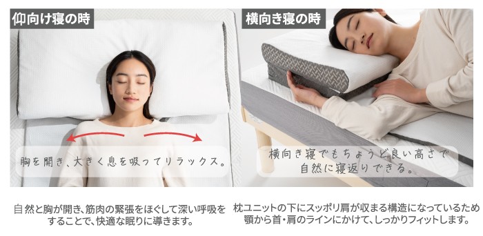 一方、センタースロープ構造は、仰向け寝時に自然と胸を開き、大きく深い呼吸を導く設計となっており、リラックスした眠りにつくことが可能。さらに、スロープの段差が最大で約5cmあるため、寝返りもしやすい。