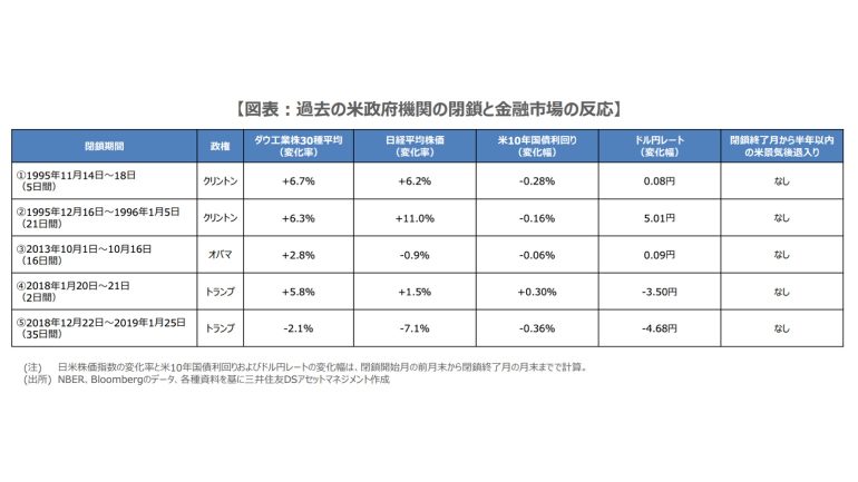 ただ、過去をみる限り、閉鎖がある程度長期化しても、金融市場や経済が大きく混乱する事態に陥ってはいない(図表)。そのため閉鎖の長期化リスクは残るが、現時点で過度に懸念する必要はないと考えている。