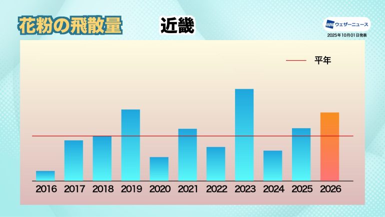 また、2025年の飛散量は前年を大きく上回り、平年と比べてもかなり多く、特に福岡県や佐賀県では記録的な大量飛散を記録した。このため、2026年は前年より飛散量が少なくなる「裏年」傾向の年となるが、花粉の雄花の生長に適した天候となり、この「裏年」傾向を緩和または相殺すると考えられる。