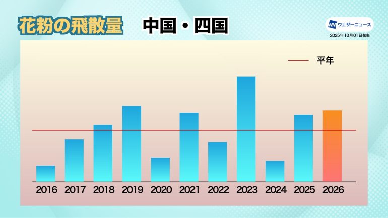 西日本では近畿や中国・四国の太平洋側で2025年を上回るエリアが多くなる一方、2025年に記録的な大量飛散となった九州北部では半減する地域もあるとみられる。