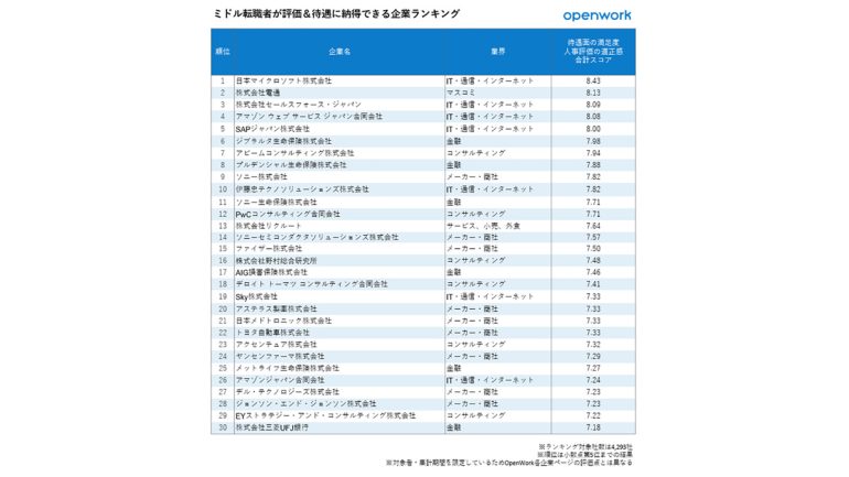 ランキングは、1位は日本マイクロソフト、2位は電通、3位はセールスフォース・ジャパンという結果だった。業界別では「メーカー・商社」、「IT・通信・インターネット」、「コンサルティング」が20社以上を占めており、特に上位10社の半数がIT企業だった。ランクイン企業のクチコミからは、成果が評価や待遇に直結して、スキルやノウハウ、人脈を携えて入社するミドル人材が活躍できる土壌があることが想像できる。
