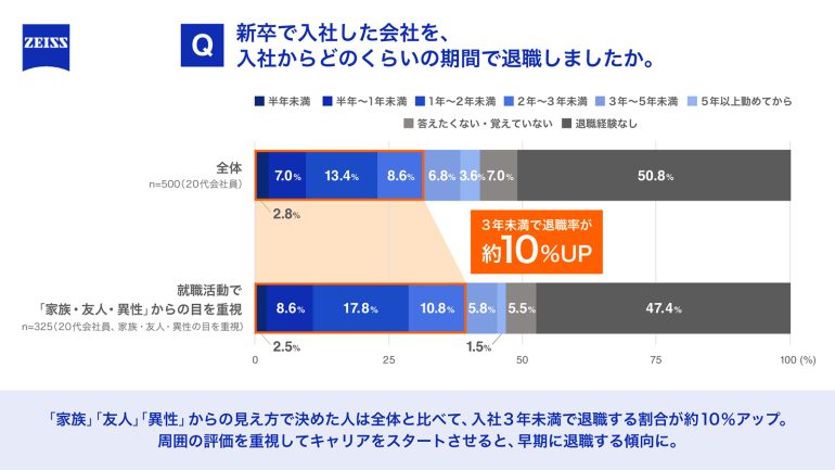 若手ビジネスパーソンにとって就職する企業は、単なる働く場所だけでなく自分の価値やセンスを示す“ブランド”としての側面もあり、本心ややりがいに加えて他者からの目線も大きな影響を与えていたという。一方で20代会社員で新卒の企業選びを「家族」、「友人」、「異性」からの見え方で決めた人の39.7%が入社3年未満で退職していた。