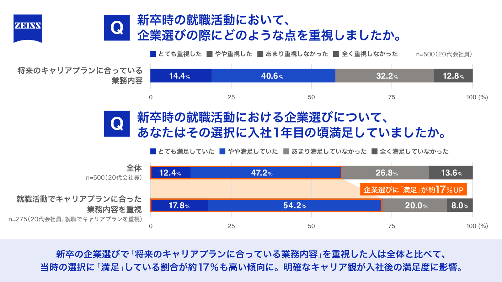 このような社会の潮流を受けて、光学・精密機器の開発製造を手掛けるカールツァイスは、コーポレートアイデンティティ「Seeing Beyond」(視る力=本質を見抜き、可能性を広げ、未来を切り拓く力)のもと、全国のビジネスパーソンを対象に「ビジネスパーソンのキャリア形成における満足度に関する調査」を実施して結果を公開した。