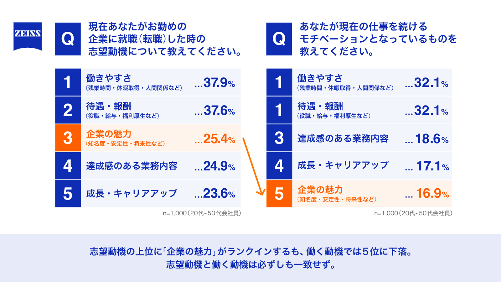 勤めている企業に就職・転職した時の志望動機では、「働きやすさ」(37.9%)がもっとも多く、次いで「待遇・報酬」(37.6%)、「企業知名度・安定性・将来性」(25.4%)という結果で、肩書や外的評価に関わる要素が上位を占めた。それが入社して働き始めると現職で働く動機についての回答は「働きやすさ」(32.1%)、「待遇・報酬」(32.1%)に続き、「達成感のある業務(18.6%)」、「成長・キャリアアップ」(17.1%)が上位だったという。入社時に上位の「企業知名度・安定性・将来性」(16.9%)は5位に下落して、肩書やブランド性は必ずしも仕事のモチベーションに直結していないという。