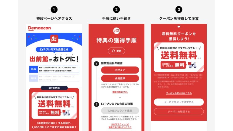 LINEヤフーと株式会社出前館(以下、出前館)は、LINEヤフーが提供する月額制サービス「LYPプレミアム」の新特典として、出前館が運営する日本最大級のデリバリーサービス「出前館」利用時の送料を無料とする特典(以下、本特典)を2025年10月1日より期間限定で開始した。