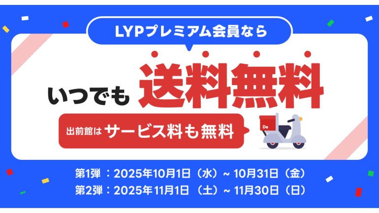 本特典は、約2400万人(2025年8月時点)の「LYPプレミアム」会員に向け、「出前館」での注文時に送料を無料とするもので、2000円(税込)以上の注文が対象。