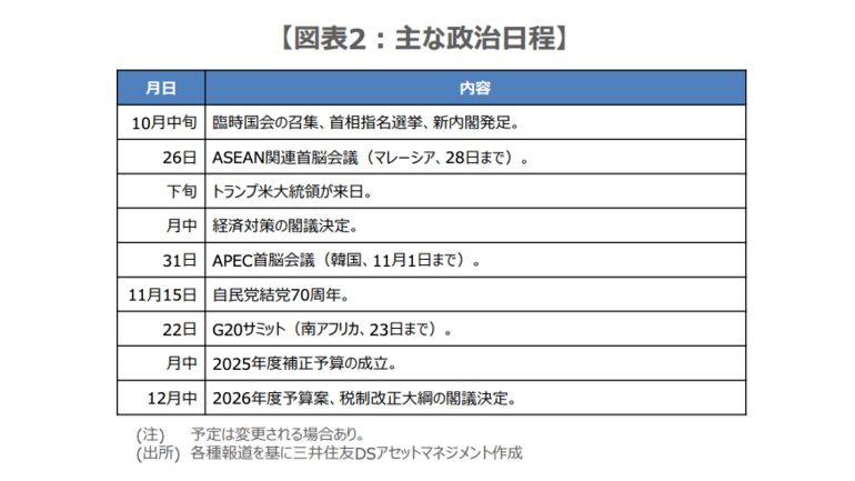 ただ、これらの動きの持続性については、野党との連携の進展度合いや、実際の経済対策の規模を見極める必要があり、この先の政治日程が特に重要になってくると考えている(図表2)。