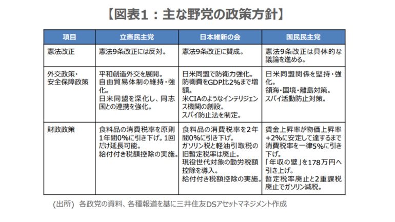 野党のなかで、連立の相手先としてよく名前の挙がるのは、立憲民主党、日本維新の会、国民民主党だ。前述の項目に関する各党の方針をみる限り(図表1)、日本維新の会と国民民主党が、連立の交渉相手になる可能性が高いように思われる。