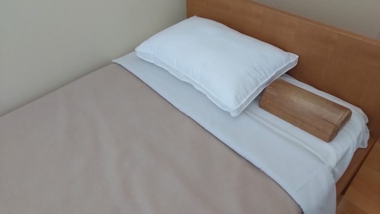 また宿泊部屋となる客室のベッドのマットレスは畳の上に敷かれており、木枕が用意されている。