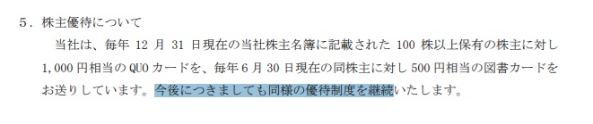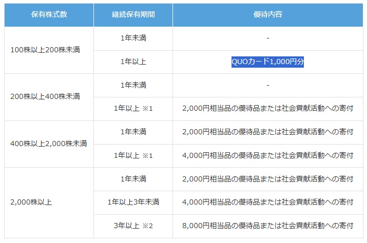 分割前の100株、1年以上保有であればQUOカード1,000円分がもらえたので、分割前50株、分割後100株もQUOカード500円分ではないかと推測できるが、これは推測であり、決定事項ではない。分割後100株も1年以上の保有が必要条件なので、何がもらえるのか予想しながら権利を取ってみよう。