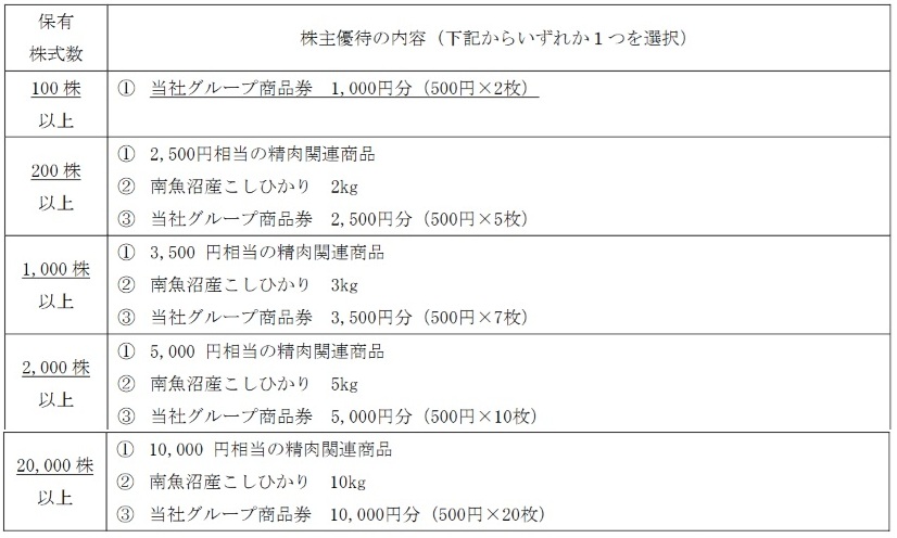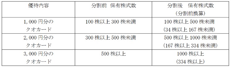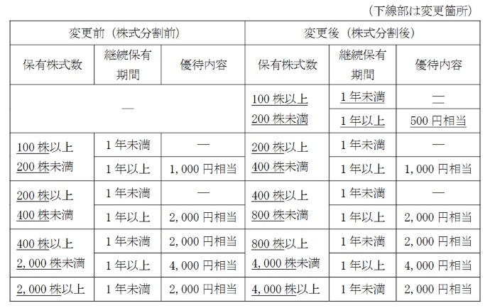 分割前100株(分割後200株)や分割前500株、1,000株、1万株保有者の株主優待の内容変更はないが、こちらも任意の日の株主番号チェックがある。貸株などをしている人は要注意だ。