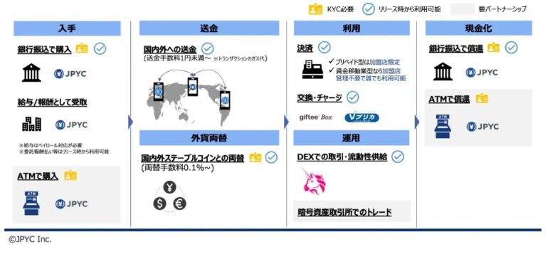 換金できない「JPYC Prepaid」という前払式支払手段をブロックチェーン上で発行していたが、今般、日本円と1:1で換金可能なステーブルコインとして、社名と同じ「JPYC」を発行するようになった。
