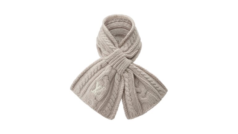 タイムレスなケーブルニットの心地よい肌触りが、ウール100%ならではの温もりを最大限に引き立てる。スリットに通して首周りにフィットさせることも、ゆったりと巻くこともできるデザインを採用した。