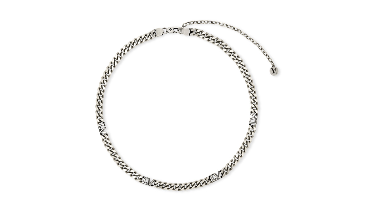 モダンでタイムレスなデザインの「ネックレス・LV クラブ チェーン」。スターリングシルバーの素材に、特徴的なフラットリンクと刻印されたLV エンブレムにブラックのパティーナ(陰影)を施した。