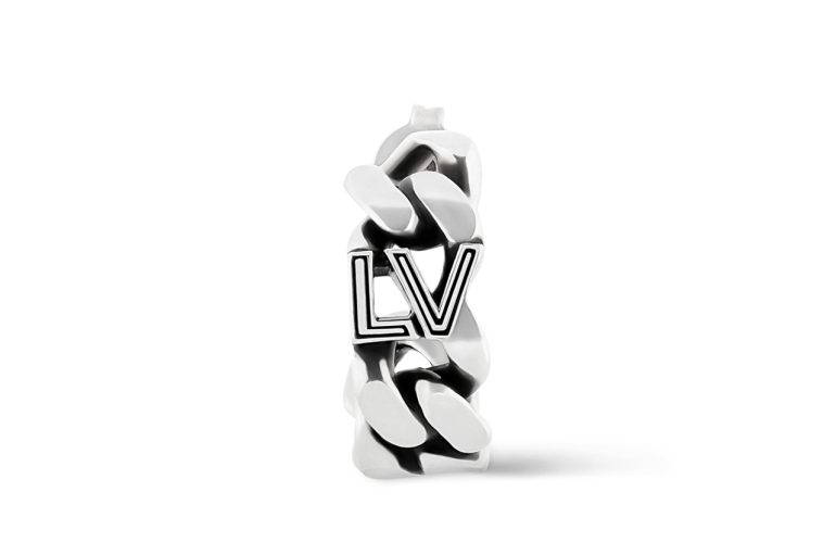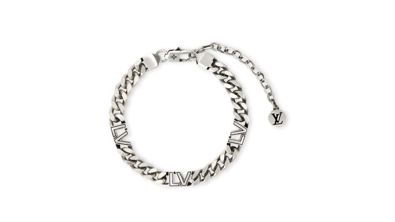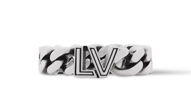 刻印されたLV エンブレムが目を引き、シルバーのフラットリンクの連なりと相まってその洗練されたスタイルを引き立てる。控えめなブラックのパティーナ(陰影)で仕上げ、立体感と重厚感をさりげなく添えている。
