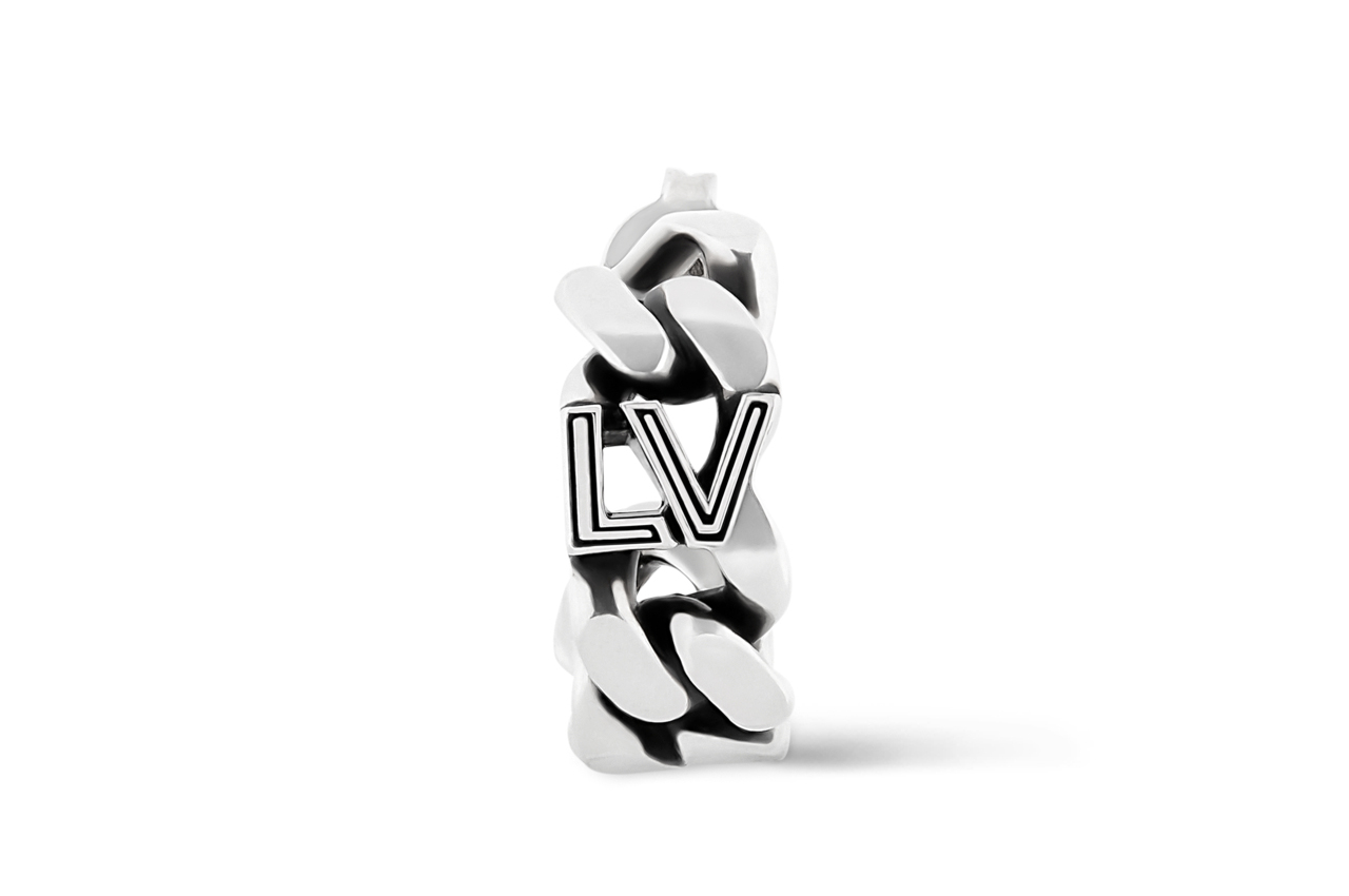一体化したフラットリンクにLV エンブレムを刻印してブラックのパティーナ(陰影)を施した「ピアス・LV クラブ チェーン (片耳用)」。モダンでありながらもヴィンテージ風、クラシカルかつコンテンポラリーな印象のデザインに仕上げた。