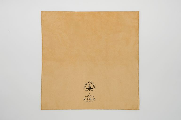 内蓋部分には、両ブランドのロゴが刻印された特別なレザーパッチが取り付けられ、眼鏡を優しくカバーする金子眼鏡特製のロゴ入りセリート(眼鏡拭き)がさらなる高級感を添える。