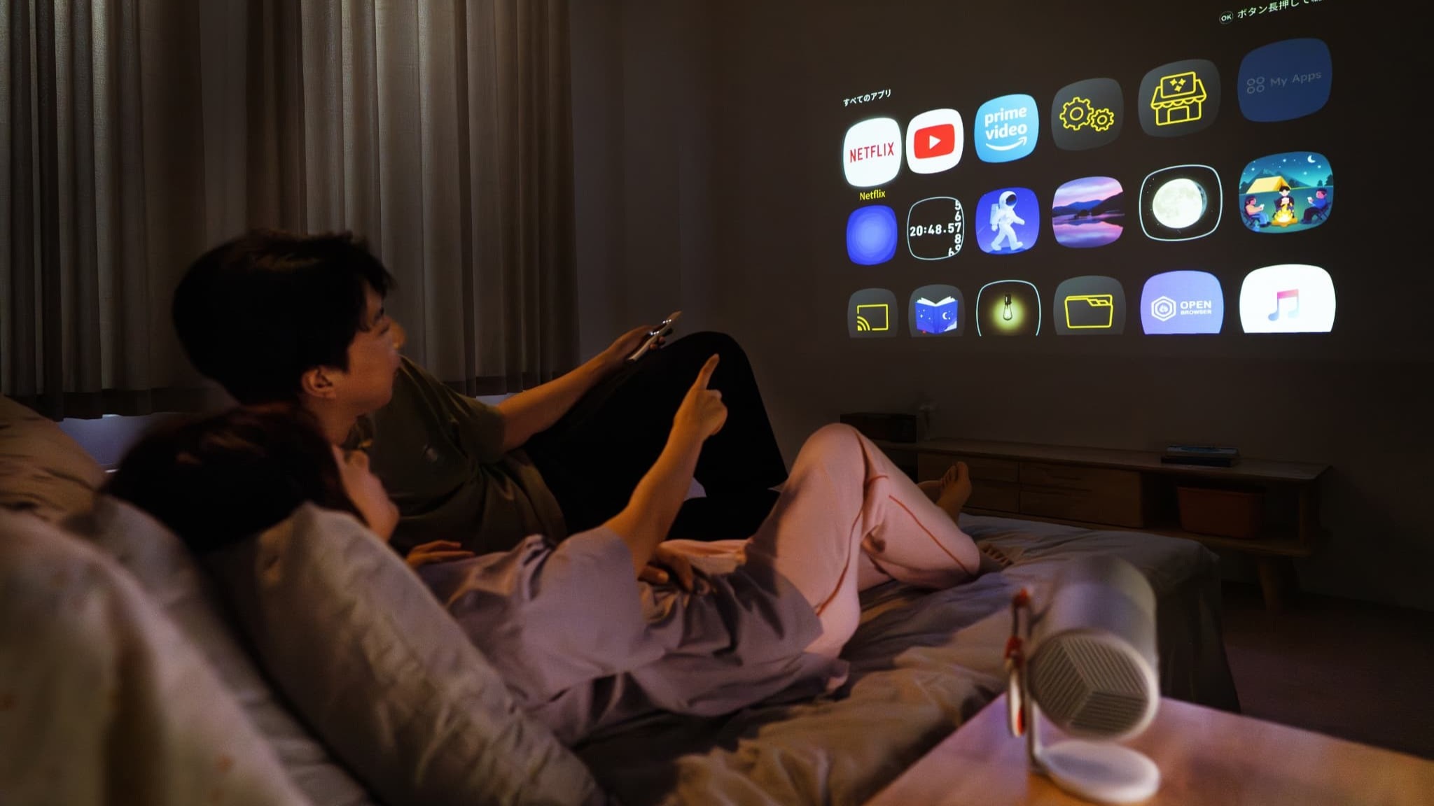 「Aladdin Poca」シリーズは、リビングや寝室からアウトドアまで幅広いシーンで利用できる20,000mAhバッテリー内蔵のポータブルプロジェクター。約1.3kgの軽量設計ながら、標準解像度は1,920×1,080ピクセル、明るさは「Aladdin Poca」が450ANSIルーメン、「Aladdin Poca Laser」が550 ANSIルーメンを実現する。