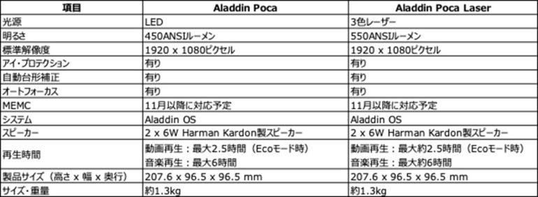ラインナップは、LED光源の「Aladdin Poca」とレーザー光源の「Aladdin Poca Laser」の2機種。通常価格は「Aladdin Pocaセット」が69,900円、「Aladdin Poca Laserセット」が99,900円だが、「Makuake」では「Aladdin Pocaセット」が最大34%OFFの45,900円から、「Aladdin Poca Laserセット」が最大34%OFFの65,900円からの特別価格で購入できる。