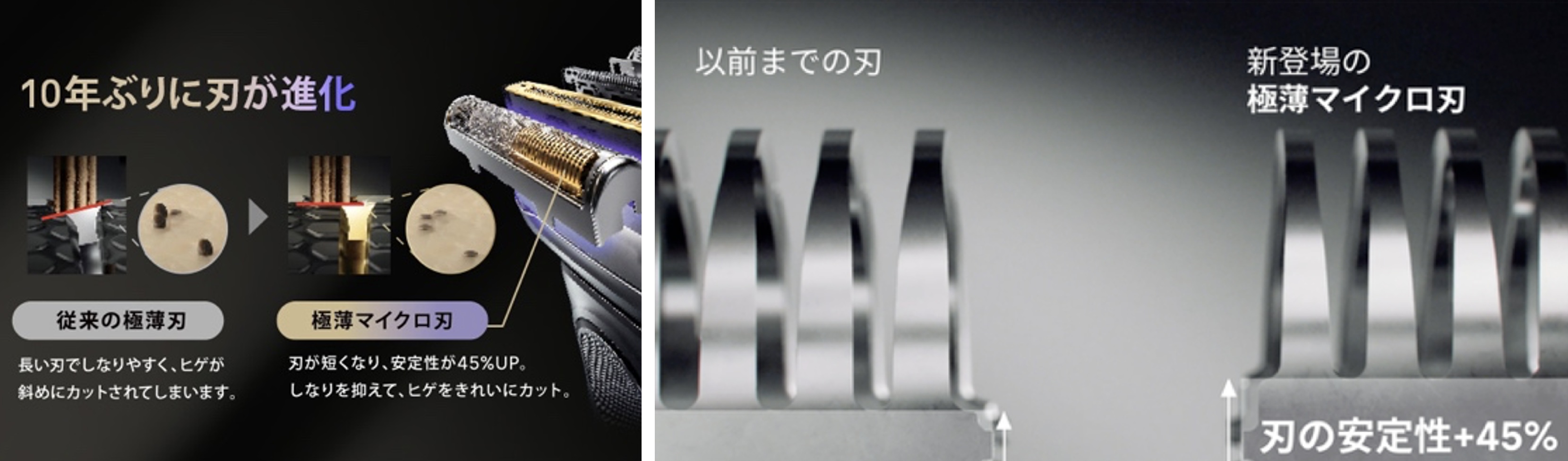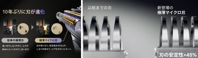 今回、この深剃り刃を約10年ぶりに刷新。進化した極薄マイクロ刃は、従来の刃より安定性が45%向上し、しなりを軽減。これにより、剃った後の肌にジョリジョリとしたヒゲの剃り残しを感じない、よりなめらかな肌下-0.01mmの深剃りを実現する。