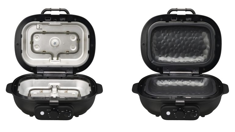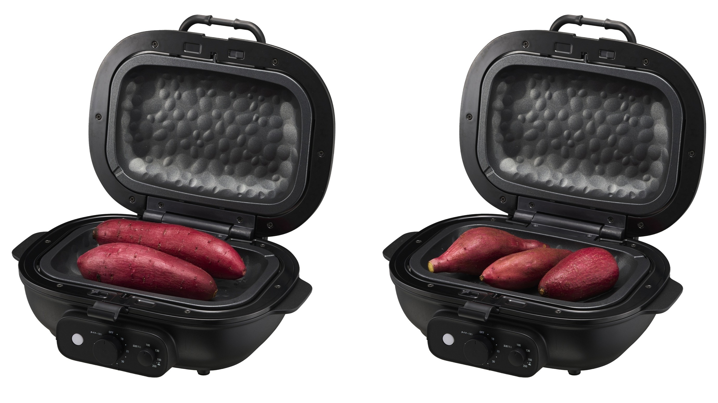 そんな本製品の特長は、さまざまなサイズのさつまいもに対応できる新プレートを採用したところ。従来品はさつまいもがぴったり入るような横長の窪みが2本分あったが、新商品ではその仕切りをなくし、1枚の大きなプレートとしたことで、大小さまざまなサイズのさつまいもを、一度に複数並べて焼けるようになったのだ。