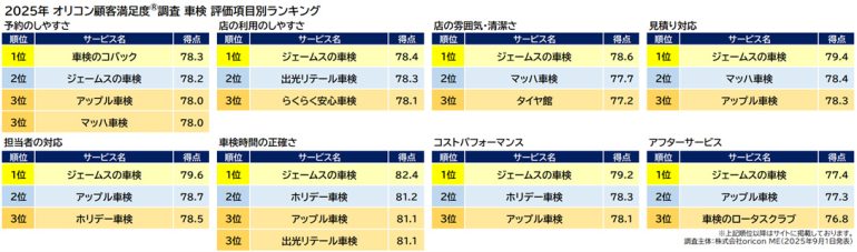 続いて総合3位には【車検のコバック】【ホリデー車検】【マッハ車検】が同点でランクインした。【車検のコバック】は前回総合8位からランクアップし、評価項目別では、「予約のしやすさ」で前回4位から順位を上げ、初の1位を獲得している。