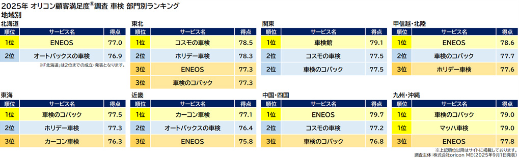 「東北」では総合12位の【コスモの車検】が1位、「関東」では【車検館】が2年連続の1位、「東海」では総合3位の【車検のコバック】が初の1位、「近畿」では総合8位の【カーコン車検】が1位、「九州・沖縄」では総合3位の【車検のコバック】と【マッハ車検】が同点で1位を獲得しており、【マッハ車検】は3年連続の1位となっている。