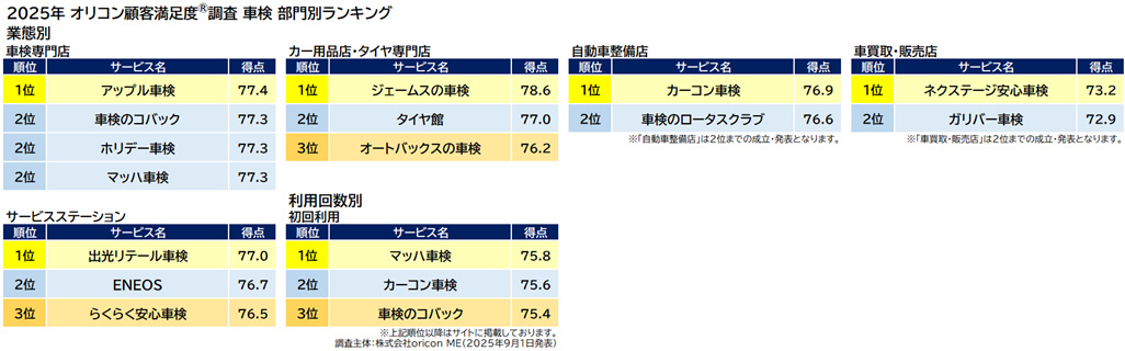 「車検専門店」では総合2位の【アップル車検】が初の1位、「カー用品店・タイヤ専門店」では総合1位の【ジェームスの車検】が3年連続の1位、「自動車整備店」では【カーコン車検】が2年連続の1位、「車買取・販売店」では【ネクステージ安心車検】が3年連続の1位、「サービスステーション」では【出光リテール車検】が2年連続の1位を獲得した。