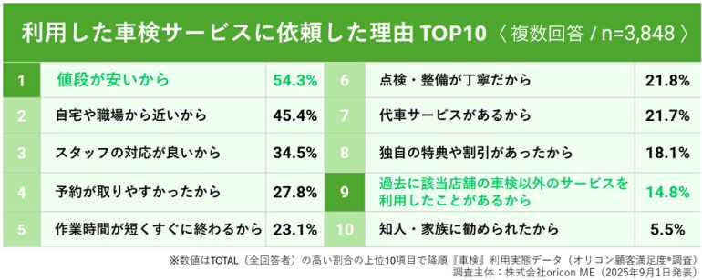 そのほかにも、「予約が取りやすかったから(27.8%)」「作業時間が短くすぐに終わるから(23.1%)」といったスムーズな対応、「代車サービスがあるから(21.7%)」「独自の特典や割引があったから(18.1%)」といった付加的なメリットも選定理由として挙がった。