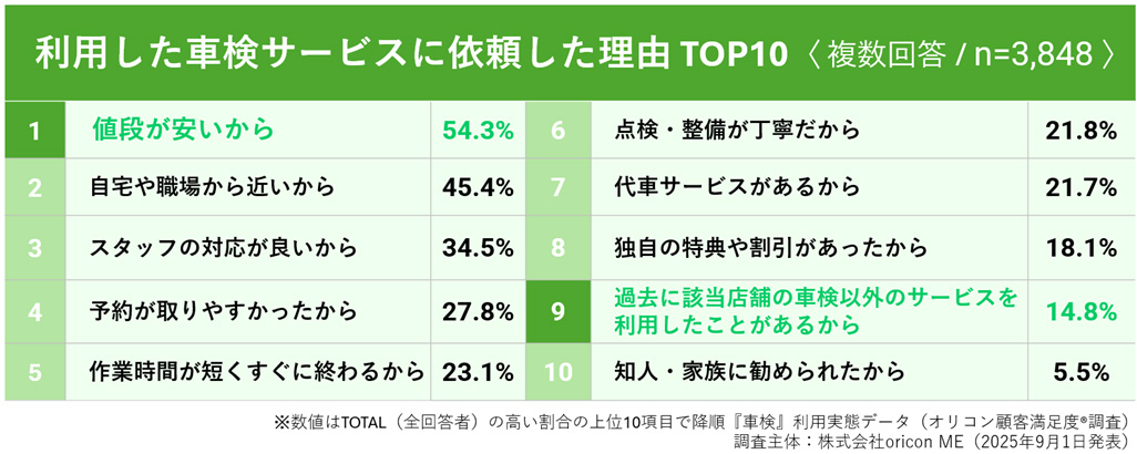 また、「過去に該当店舗で車検以外のサービスを利用したことがあるから(14.8%)」という声も見られ、普段から利用している店舗への信頼や親しみやすさも、サービス選びに影響していると考えられる結果となった。
