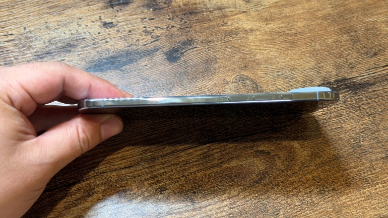 厚さ5.64mm、質量165gの薄型軽量ボディは、これまでiPhoneの4モデル目としてラインナップされてきた、miniやPlusとは明らかに違う、異質な印象を受ける。薄すぎて逆に持ちにくいのではないかという懸念もあったが、実際に使用している感触として、使いにくさを感じることはない。むしろ、圧倒的な薄さ、軽さから、持っていて楽しいと感じられる。ただし、側面に指紋が付着するのが、気になる人もいるだろう。