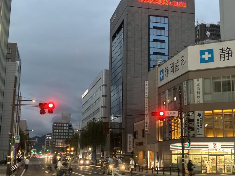 いよいよ夜に突入しようという静岡の街並みを、iPhone 16eで撮ってみようという算段である。
