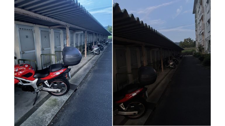 なお、下の写真は「駐輪場のバイクにピントを合わせるか」「空にピントを合わせるか」で、ここまで明るさが変わってくるという例である。