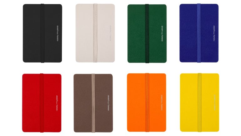 8色展開で登場し、表紙にはISSEY MIYAKEロゴをシルバー箔で背面にはMOLESKINEロゴを型押しであしらい、表紙中央に刻まれた一本の型押しの線に沿って走るゴムバンドがミニマルな存在感を添えている。