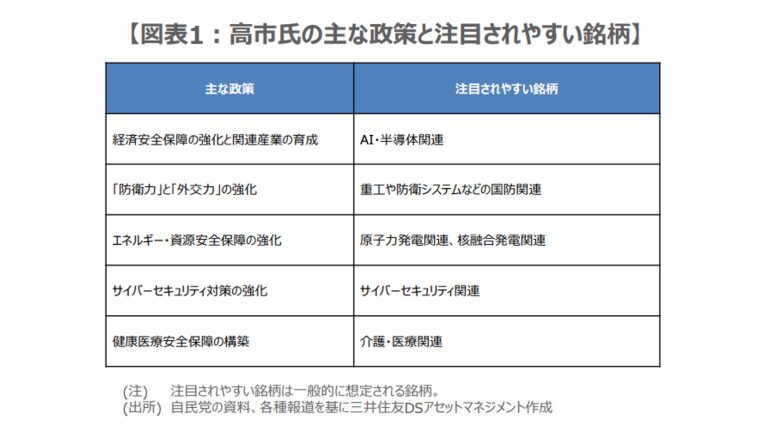 株式市場では、高市氏が掲げる政策に沿った銘柄に注目する動きがみられる。改めて高市氏の政策を確認すると、「経済安全保障の強化と関連産業の育成」を掲げており、経済安全保障に不可欠な成長分野として、AI(人工知能)や半導体などを挙げている。