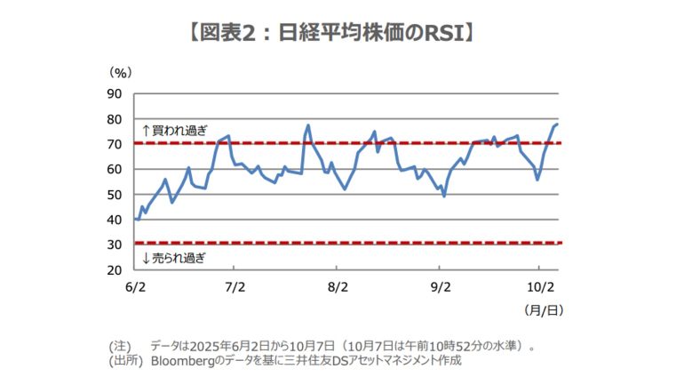 日経平均は本日も続伸し、寄り付き後、ほどなく4万8527円33銭の高値をつけた。節目の4万6000円、4万7000円、4万8000円を一気に突破したことで、相場の過熱感をみる「RSI(相対力指数)」は直近で約78%と、買われ過ぎとされる70%水準を超えている(図表2)。