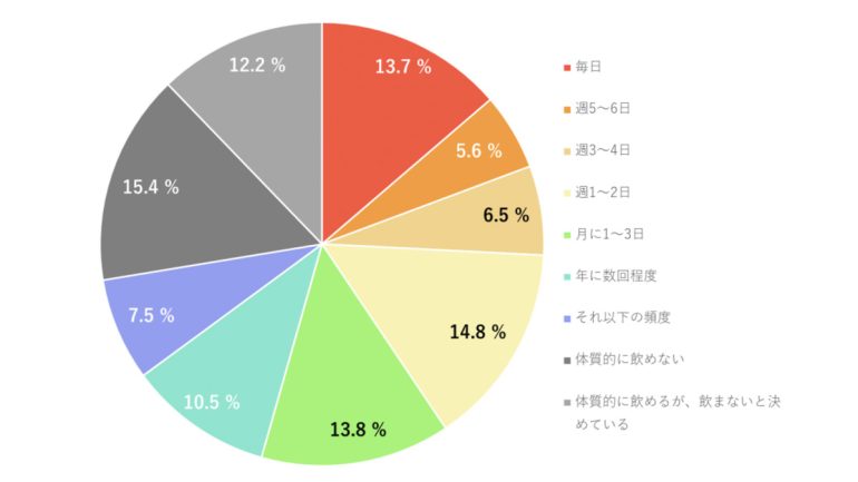 まず「あなたはどれくらいの頻度でお酒を飲みますか?」という質問をしたところ、「毎日」(13.7%)、「週5~6日」(5.6%)と飲酒頻度が高い人は19.3%、「体質的に飲めない」(15.4%)、「体質的に飲めるが、飲まないと決めている」(12.2%)と全く飲まない人は27.6%程度。