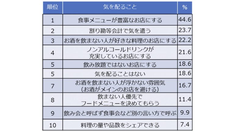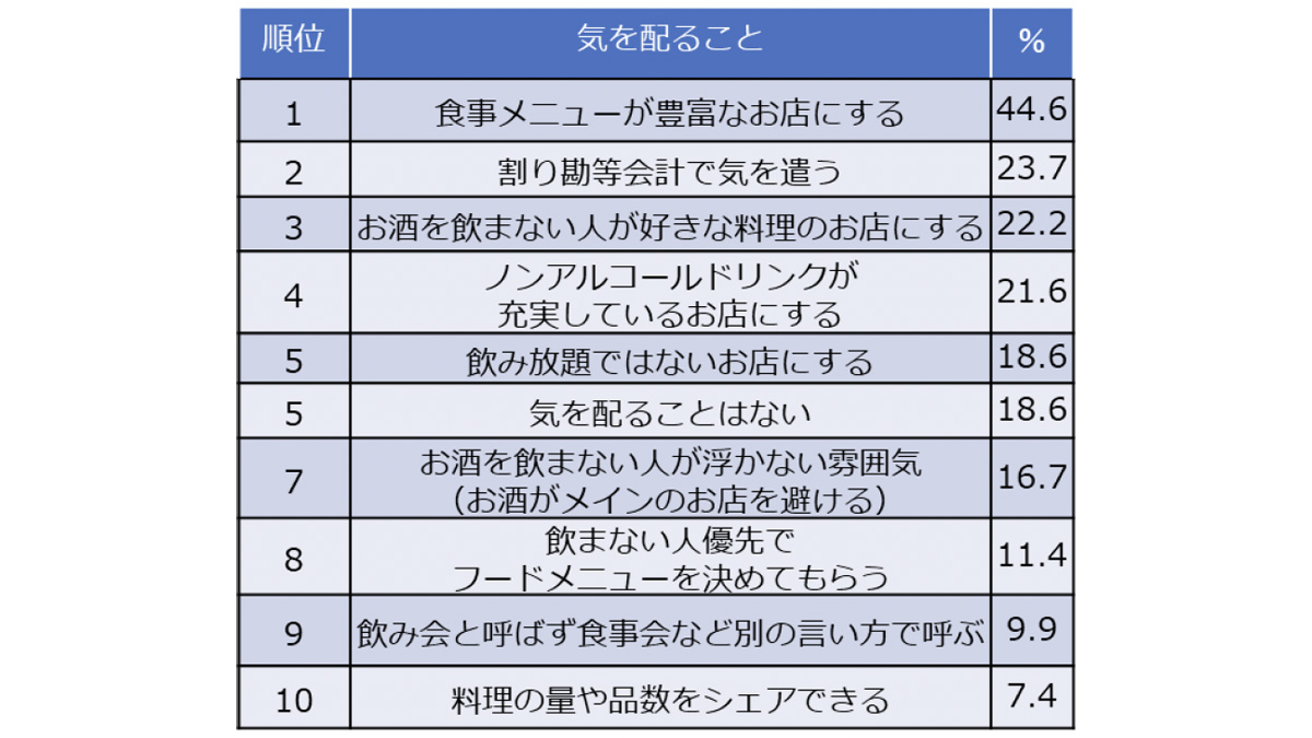 「割り勘等会計で気を遣う」(23.7%)、「お酒を飲まない人が好きな料理のお店にする」(22.2%)、「ノンアルコールドリンクが充実しているお店にする」(21.6%)が続いた。