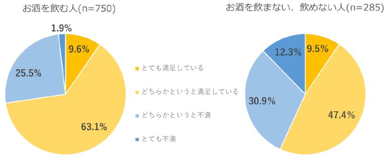 「一般的な居酒屋などの飲み屋さんのノンアルコールドリンクの品ぞろえについて、満足していますか?」と聞いたところ、「お酒を飲む人」は「不満」が27.4%だったのに対し、「お酒を飲まない、飲めない人」は43.2%で、こちらもお酒を飲むかどうかで結果が分かれた。
