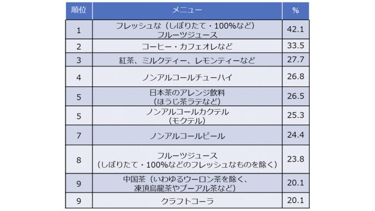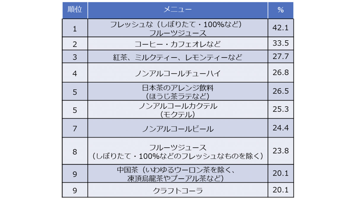 2位以下は「コーヒー・カフェオレなど」(33.5%)、「紅茶、ミルクティー、レモンティーなど」(27.7%)、「ノンアルコールチューハイ」(26.8%)、「日本茶のアレンジ飲料(ほうじ茶ラテなど)」(26.5%)が続いた。