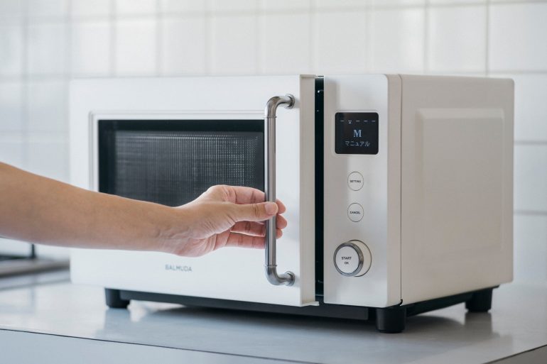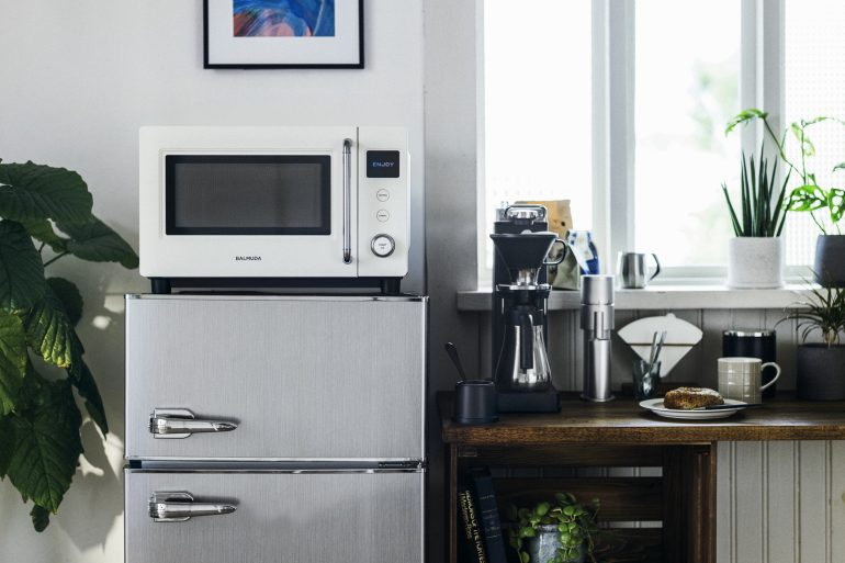 「BALMUDA The Range S」は、毎日使う調理道具として、上質なデザインと質感を備えた単機能レンジ。高さと奥行きを抑えたコンパクトな横開き設計で、収納ラックや冷蔵庫の上など、限られたスペースにも設置できるので、自分好みにコーディネートを楽しめる。