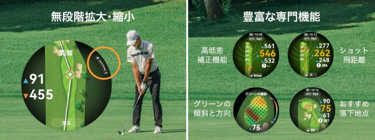 また、コースの見たいところをタッチすれば、クラウンで縮小拡大することが可能。さらに、三点間距離測定や高低差補正表示、グリーンの傾斜と方向の表示、1打前のショット距離表示、おすすめのクラブの提案といった機能も搭載する。