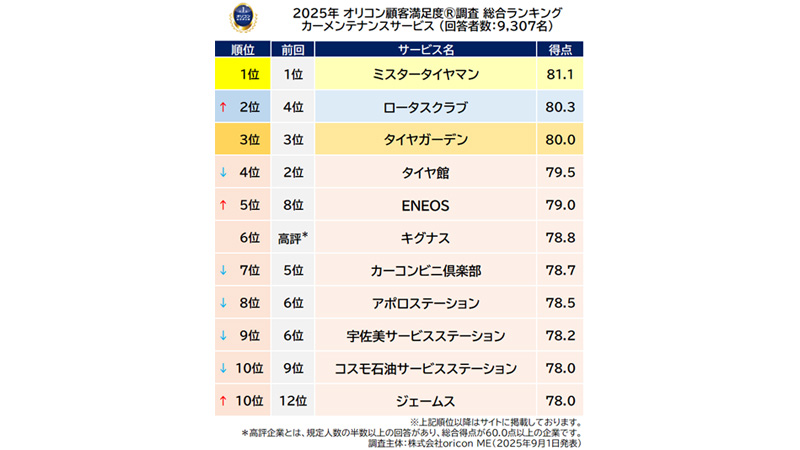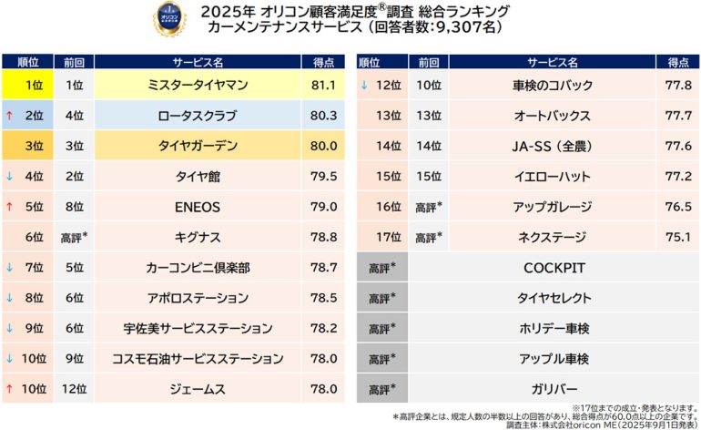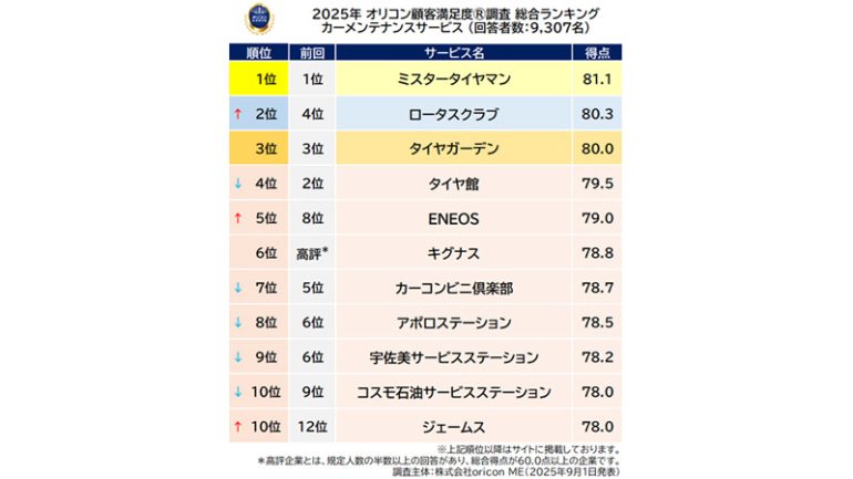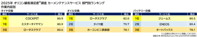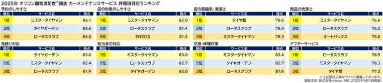 『カーメンテナンスサービス』…【ミスタータイヤマン】が2年連続の総合1位、「予約のしやすさ」「交換・修理作業」など5項目で2年連続の1位