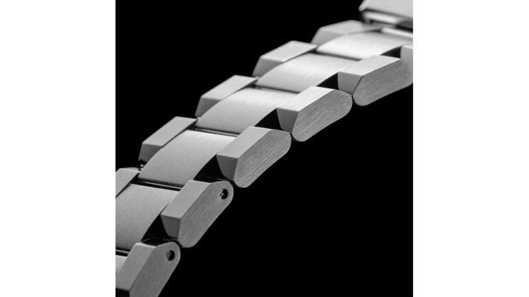 エッジ部分をミラー仕上げで面取りすることで引き締まった造形をいっそう際立たせ、ラグジュアリースポーツウォッチとしての風格も備える。