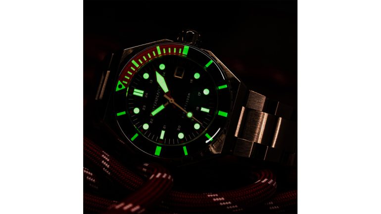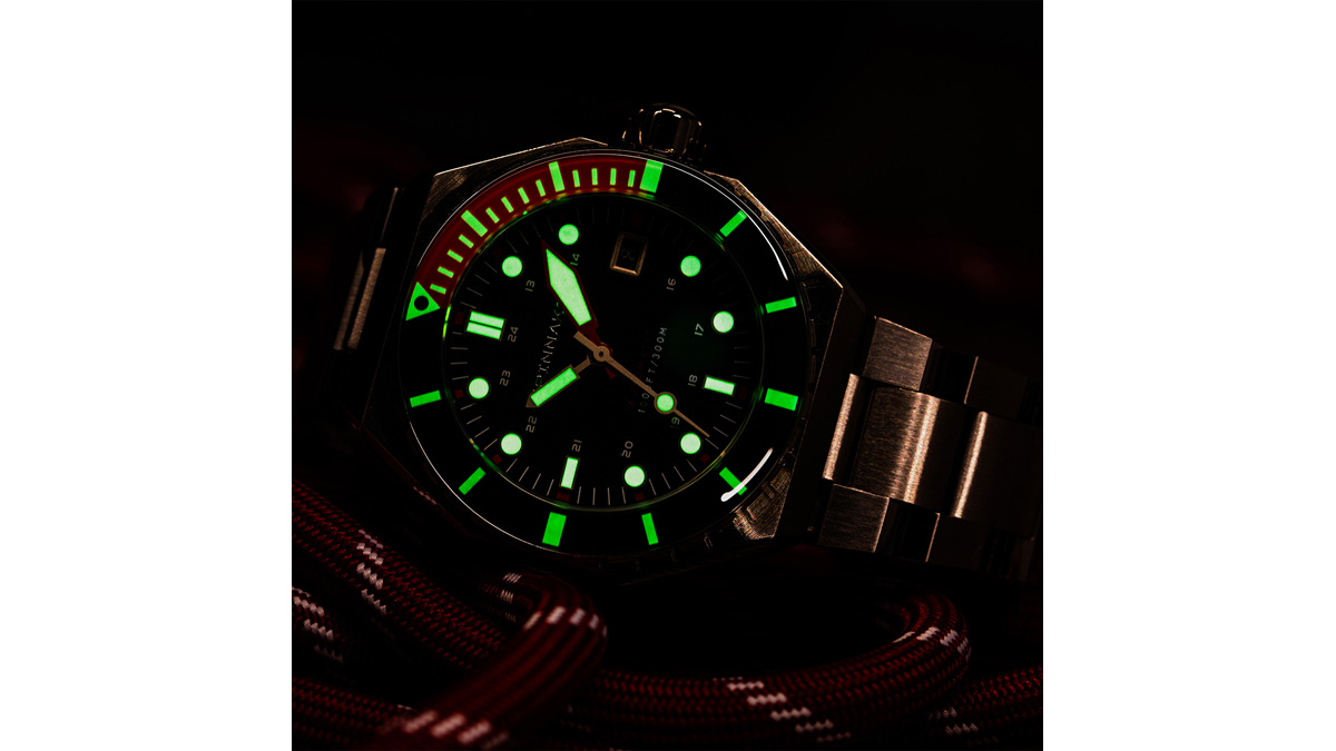 針とインデックス、ベゼルにスイス製の蓄光塗料であるスーパールミノバを使用。蓄光塗料の中でも発光量が大きく、発光時間も長いのが特徴で、深海など光の届かない場所での視認性も備えている。
