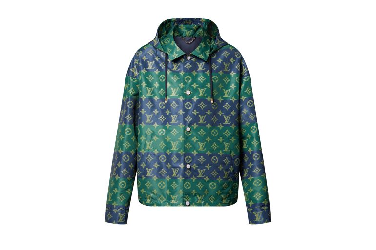 テクニカル素材を使用し、ブルー&グリーンのボーダーの全面にトロンプ・ルイユ(騙し絵)風のきらめきを放つモノグラム・パターンを重ねた、本コレクションのスポーティなモノグラム・ヘリテージ モチーフをプリントした。