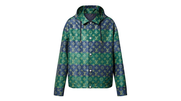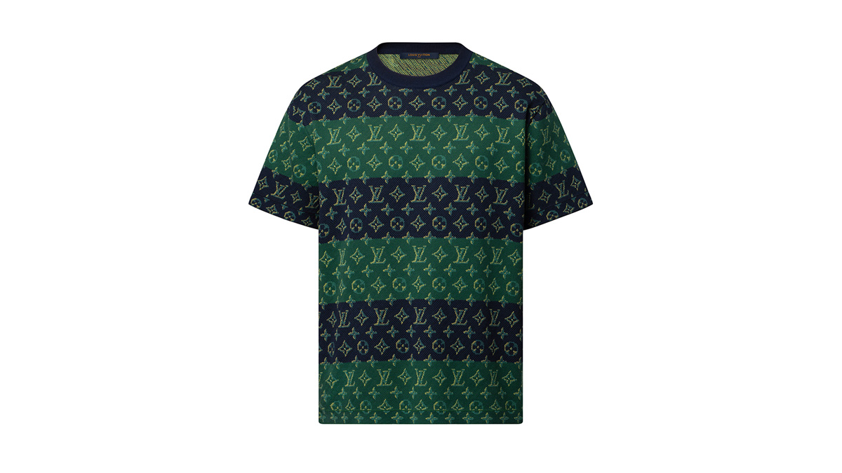 テクニカル素材を使用し、ブルー&グリーンのボーダーの全面にトロンプ・ルイユ(騙し絵)風のきらめきを放つモノグラム・パターンを重ねた、本コレクションのスポーティなモノグラム・ヘリテージ モチーフをプリントした。