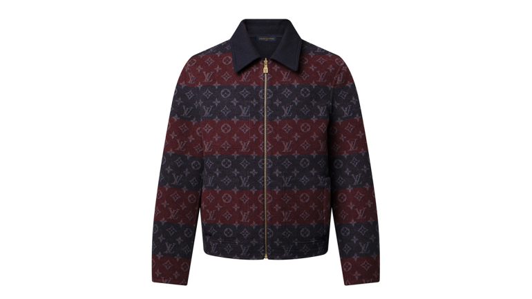 タイムレスなネイビーブルーの片面の胸元にはメタルのLV オーナメントを配し、もう片面にはスポーティなネイビー&バーガンディのボーダーをあしらったモノグラム・ヘリテージ ジャカードを使用した。